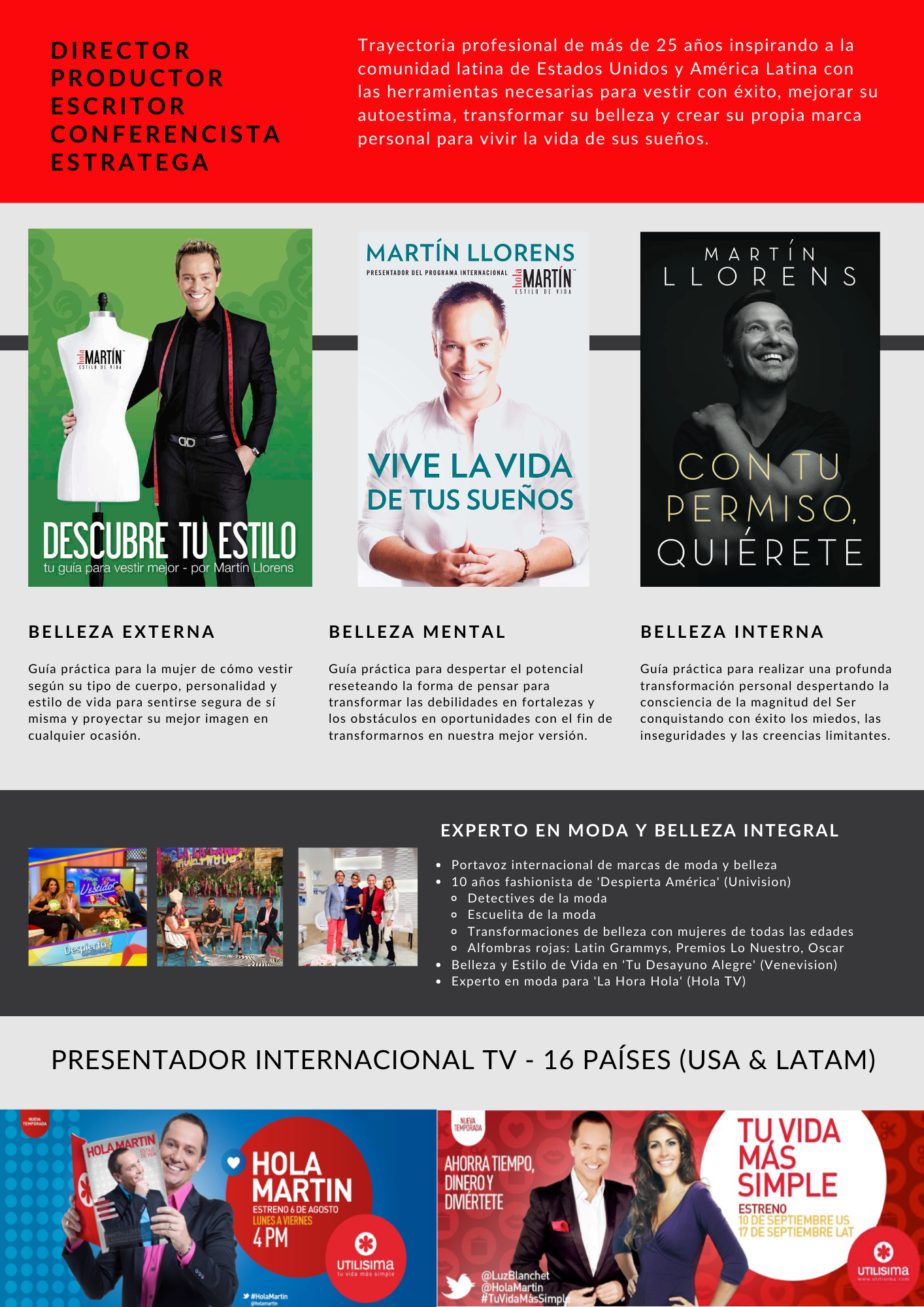 Reconocido internacionalmente en más de 16 países por sus populares programas de televisión ‘Hola Martín’ y ‘Tu Vida Más Simple’ en el canal de Utilísima / Mundo Fox / Fox Life y por sus segmentos de moda en el programa nacional ‘Despierta América’ en el canal de Univision, Martín se ha convertido en el Experto de la Belleza Integral, trabajando tanto la belleza externa de las personas como su imagen mental y su belleza interna, y en un formador de Líderes con Consciencia para responsabilizarnos, a través del ejemplo personal, del bienestar, la prosperidad, y la paz sostenida que deseamos ver en nuestras familias, en la sociedad y en el mundo.